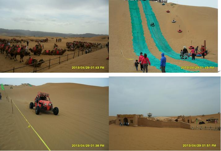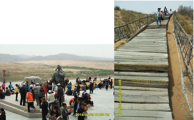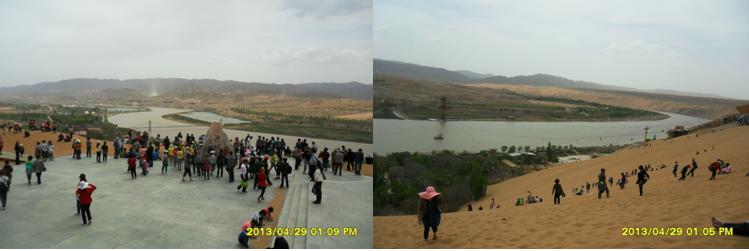 沿著黃河?xùn)|岸,由南向北,走在河岸邊的木質(zhì)人行棧道上,微風(fēng)輕拂,游客熙熙攘攘。棧道下面,不時發(fā)出一陣陣黃河浪拍打岸邊卵石的聲音,棧道西側(cè)是廣際的黃河河面,沙坡頭特有的羊皮筏子載著游客,順著主河道東側(cè)漂流而過,偶爾漂入浪谷,游客不時發(fā)出一些驚嚇聲;主河道及西側(cè),間或有旅游快艇飛馳而過,拉起一道道浪花。棧道東側(cè)是旅游觀光車的通道,乘坐觀光車每人次費用20元,觀光車駕駛員兼講解員,沿途不停的向游客解說景點。路邊涼皮、涼面小攤,食物價格不菲,一份6元的涼皮、涼面賣到10元,一只4元的鹵雞腿售價7元,普通瓶裝健力寶等飲料賣到5元,比市區(qū)價格多出2元。